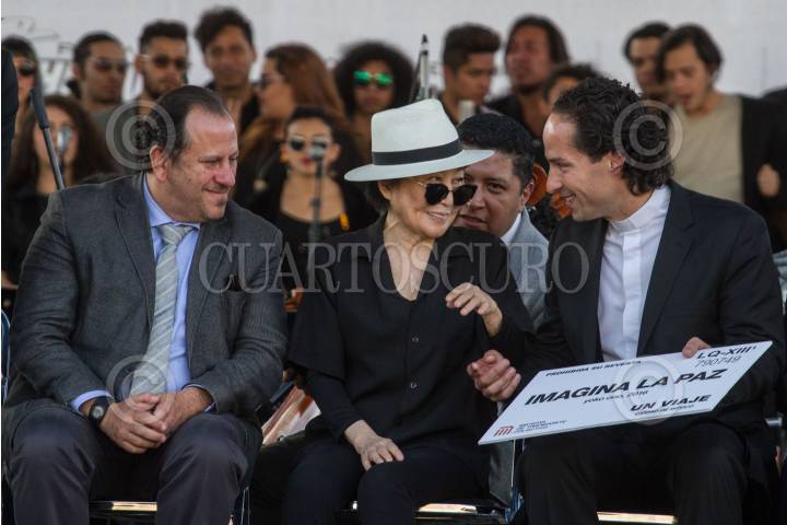 CIUDAD DE MÉXICO, 02FEBRERO2016.- Eduardo Vázquez Martín, secretario de Cultura, la artista Yoko Ono y Álvaro Lozano Platonoff, director de la Comisión de Cultura Arzobispado de México, durante inauguración de la pieza "El árbol de los deseos" en el Zócalo capitalino, la cual forma parte de la exposición "Tierra de Esperanza". Durante la ceremonia, la viuda del músico John Lennon recibió un boleto conmemorativo del STC Metro y bailó con la orquesta Sinfónica Juvenil Ollin Yoliztli. FOTO: ISAAC ESQUIVEL /CUARTOSCURO.COM