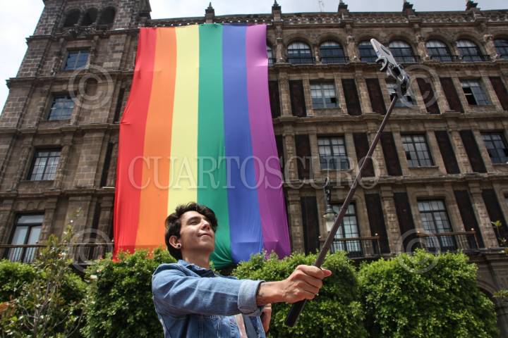 Capitalino se toma una selfie con las banderas LGBTTTIQ+ colocadas en edificios de gobierno.