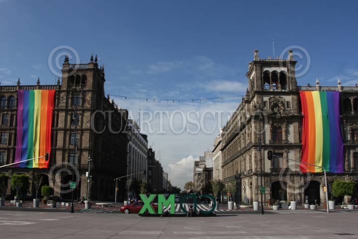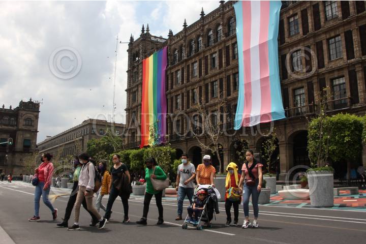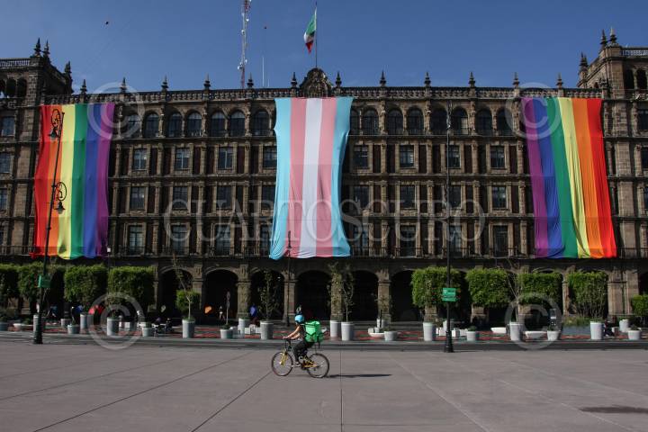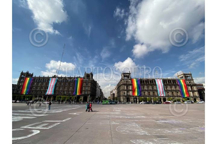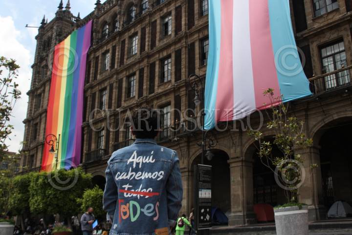 Aspectos de consignas en ropa y banderas LGBTTTIQ+ en el Zócalo.