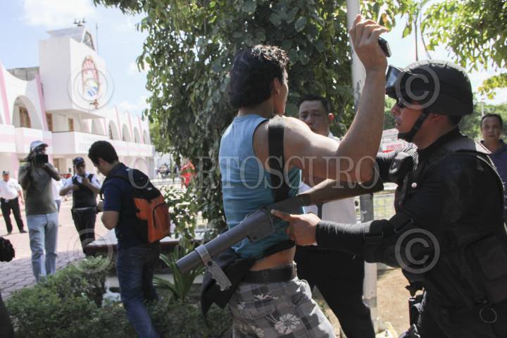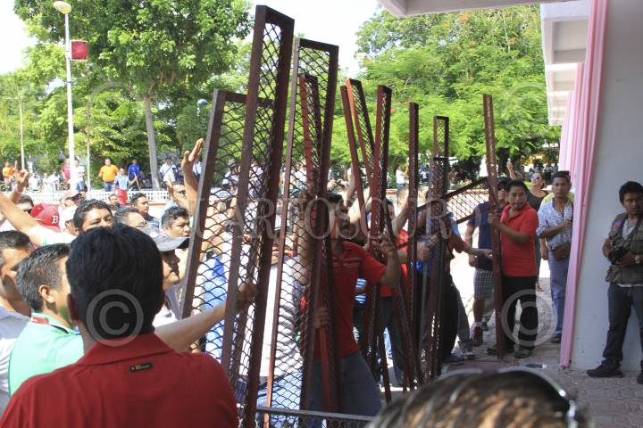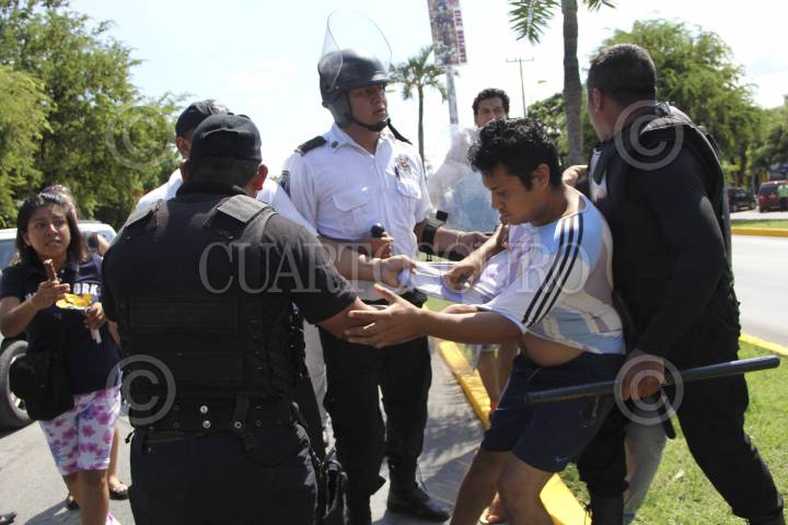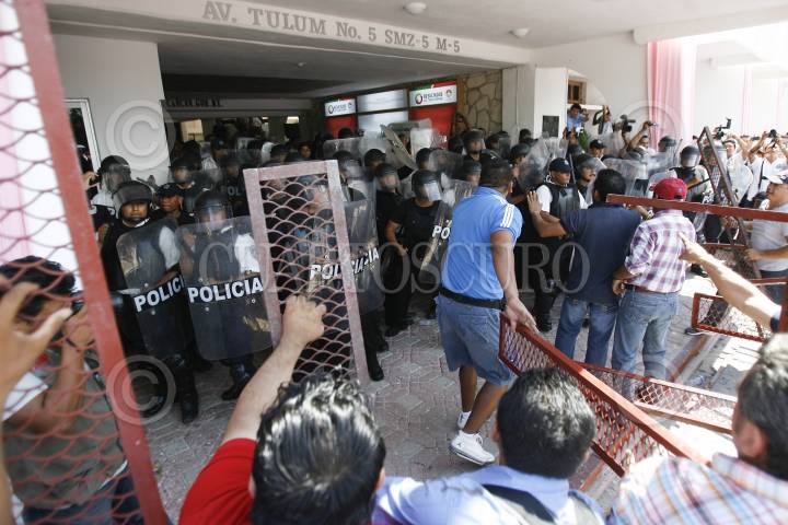CANCÚN, QUINTANA ROO, 14OCTUBRE2013.- Maestros fueron desalojados por policías antimotines luego de que ingresaron al Palacio del Ayuntamiento a exigir un diálogo con las autoridades. FOTO: ELIZABETH RUIZ /CUARTOSCURO.COM