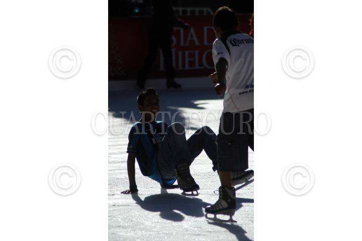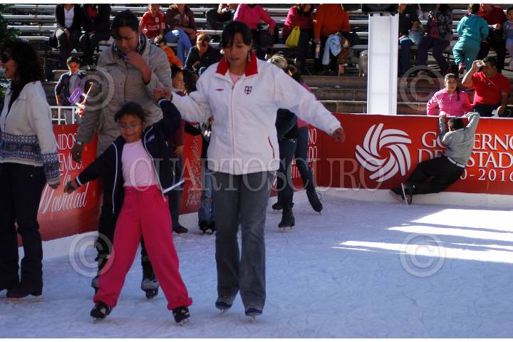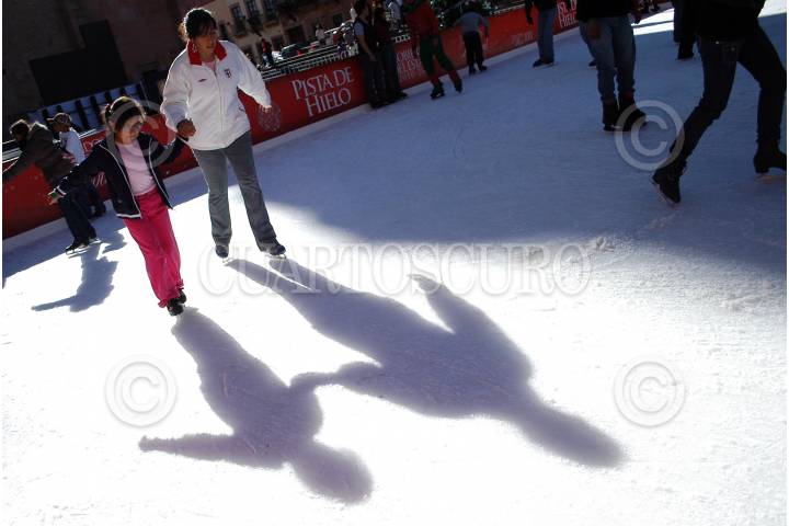 ZACATECAS, ZACATECAS, 18DICIEMBRE2010.- Apesar de las caídas y los problemas para patinar cientos de zacatecanos se divierte en la pista de hielo, inaugurada ayer por la noche en la Plaza de Armas. FOTO: ADOLFO VALTIERRA/CUARTOSCURO.COM