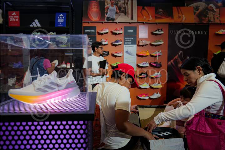 CIUDAD DE MÉXICO, 23AGOSTO2024.- Dos personas probaron zapatillas durante la Expo Maratón en el World Trade Center, en celebración del Maratón de la Ciudad de México, que se llevará a cabo el próximo domingo 25 de agosto, desde Ciudad Universitaria hasta el Zócalo capitalino. FOTO: ALICE MORITZ/CUARTOSCURO.COM