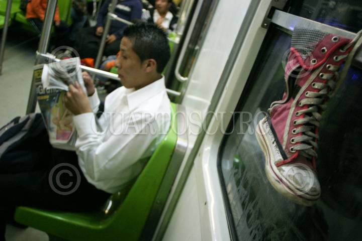 MÉXICO, D.F., 27JULIO2010.- Un pasajero del Sistema de Transporte Colectivo Metro (STCM), lee el periódico, a la par de que un zapato-tenis se cuelga por una de las ventanas de este medio de transporte. FOTO: MISAEL VALTIERRA/CUARTOSCURO.COM