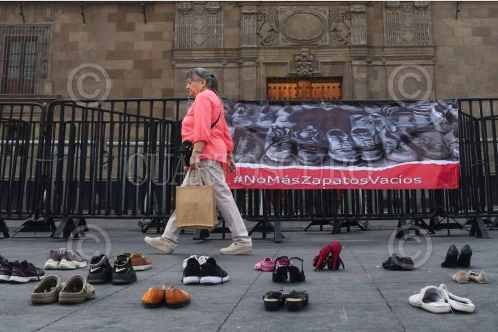 CIUDAD DE MÉXICO, 08MAYO2025.- Decenas de zapatos fueron colocados frente a Palacio Nacional, como parte de la protesta de la organización civil "No más zapatos vacíos" en exigencia de justicia por las personas asesinadas y desaparecidas en el país. FOTO: MARIO JASSO/CUARTOSCURO.COM