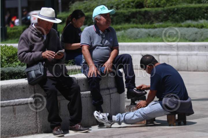 CIUDAD DE MÉXICO, 29JULIO2025.- Un boleador lustra los zapatos de un señor en las jardineras de Bellas Artes. FOTO: GRACIELA LÓPEZ/CUARTOSCURO.COM