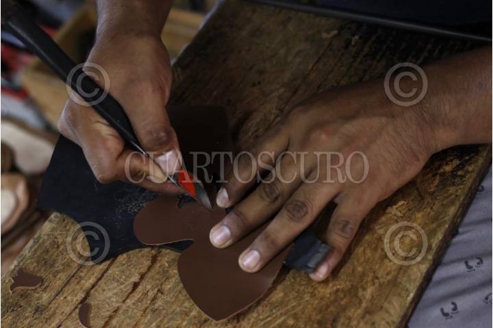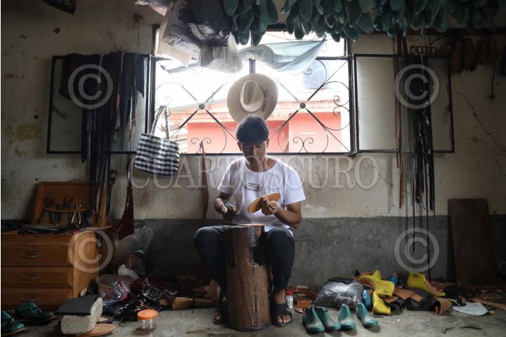 VILLA HIDALGO YALÁLAG, OAXACA, 09AGOSTO2025.- Desde 1956 la familia Aquino inició la elaboración artesanal de huaraches en Villa Hidalgo Yalálag, el calzado tradicional que se trabaja en piel vacuna ha cobrado relevancia en los últimos días debido al lanzamiento de los “Oaxaca Slip On” que la empresa alemana Adidas en colaboración con el diseñador estadounidense Willy Chavarría lanzó a inicios de agosto y que retoma la silueta de los huaraches. tejidos que se realizan en esta comunidad de la Sierra Norte ubicada a 117 kilómetros de la capital de Oaxaca. Autoridades municipales y estatales reclamaron a la transnacional y al diseñador la apropiación cultural que se hizo del calzado y el uso del nombre “Oaxaca”; la familia Aquino cuyo arte a pasado de generación en generación afirmó que se reunirán con artesanos de la población para determinar las acciones de reparación del daño que ofreció la transnacional, lamentaron que mientras ellos elaboran de 15 a 18 pares por semana, las empresas globales trabajan en masa restándole importancia al trabajo artesanal, además advirtieron que esto deprecia el arte, pues mientras las personas pagan millas de pesos por un par de tenis, continúan regateando por el elaborado calzado a mano. En Villa Hidalgo Yalálag los huaraches son parte importante de la indumentaria diaria, es un calzado que se utiliza tanto para ir al campo o asistir a celebraciones como una boda. FOTO: CAROLINA JIMÉNEZ/CUARTOSCURO.COM