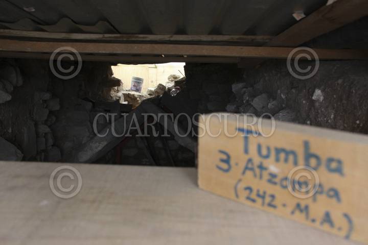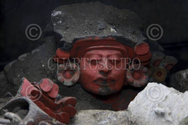 SANTA MARÍA ATZOMPA, 23AGOSTO2012.- La zona arqueológica, "Conjunto Monumental Atzompa", la cual es intervenida por el Instituto Nacional de Antropología e Historia (INAH) durante seis etapas (seis años), en los últimos tres meses se descubrió el entierro de un "individuo" de alto rango en la sociedad zapoteca en la tercera tumba de la zona. En dicho sitio fue hallada una vasija roja con rostro humano que data del 650 - 850 D.C.. FOTO: ARTURO PÉREZ ALFONSO /CUARTOSCURO.COM