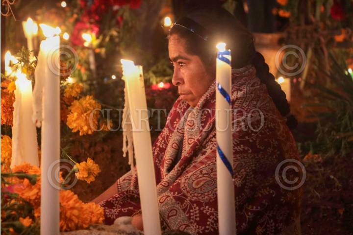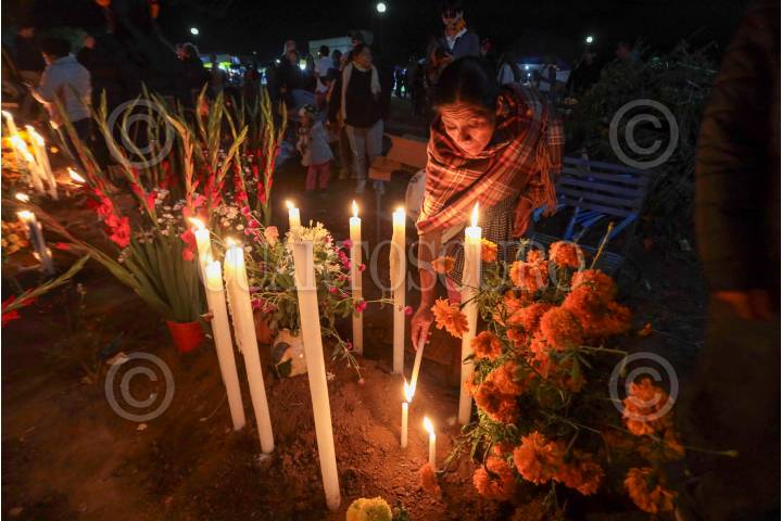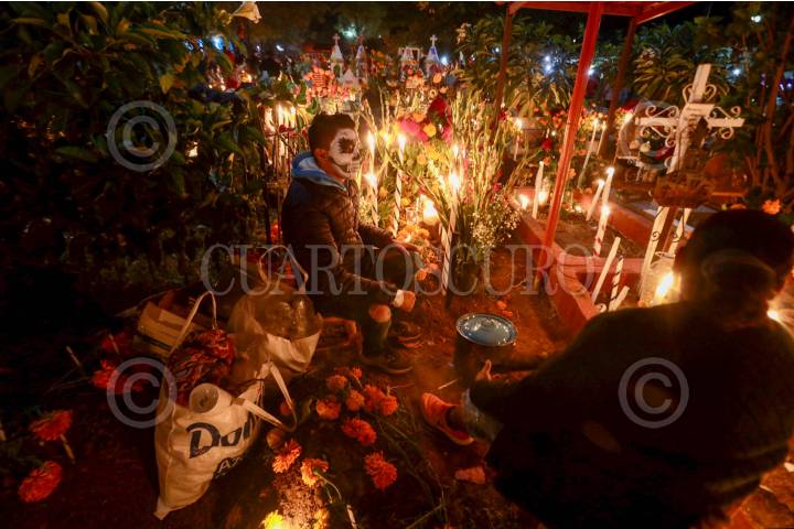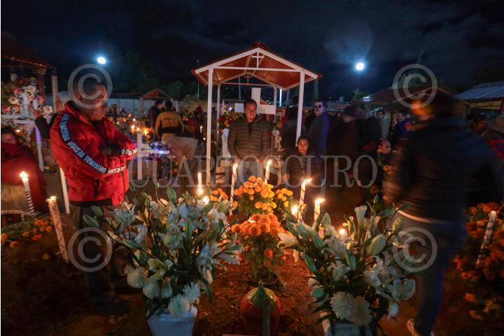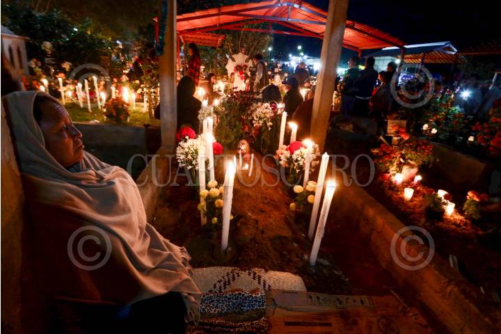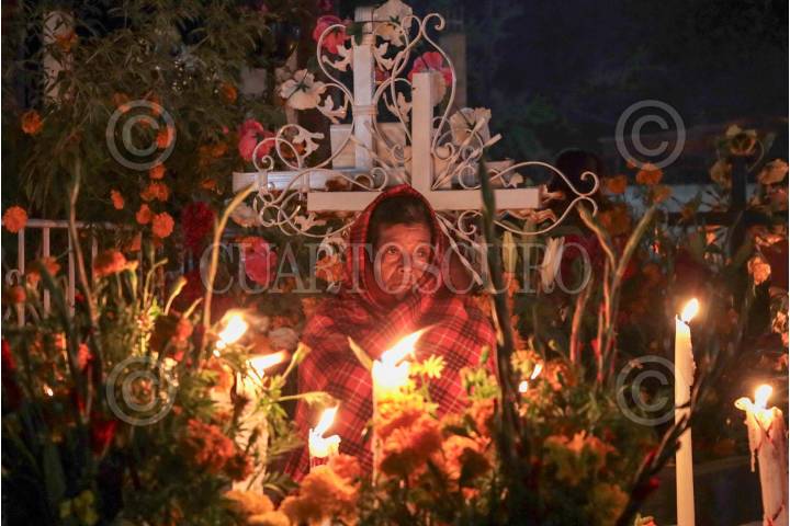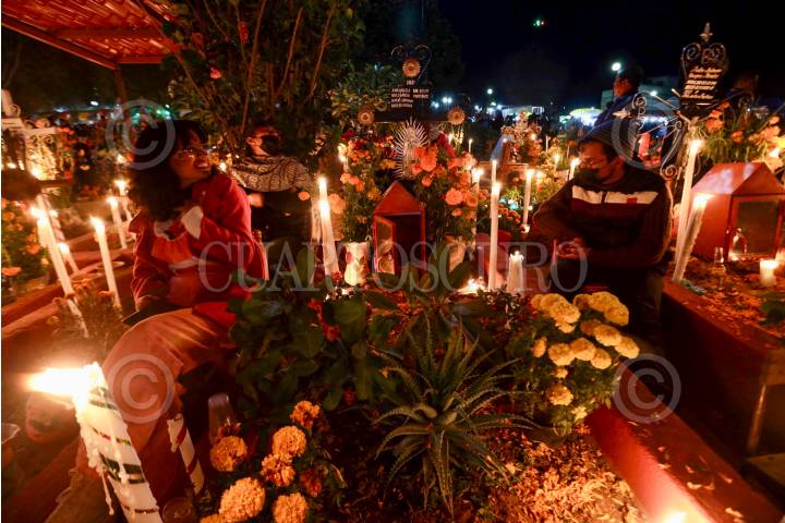 SANTA MARÍA ATZOMPA, OAXACA, 01NOVIEMBRE2023.- Pobladores de Santa María Atzompa, municipio zapoteca conurbado a la capital de Oaxaca, acudieron a velar las tumbas de sus familiares en el panteón de la comunidad y con ello recibirlos, como es su tradición, para la celebración de Día de Muertos. Las sepulturas son adornadas con velas y flores y familias enteras pasan la noche en el cementerio para recibir a sus difuntos. FOTO: CAROLINA JIMÉNEZ/CUARTOSCURO.COM