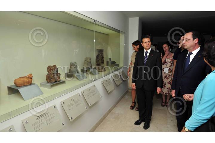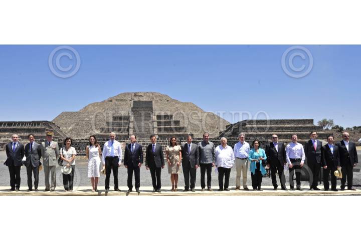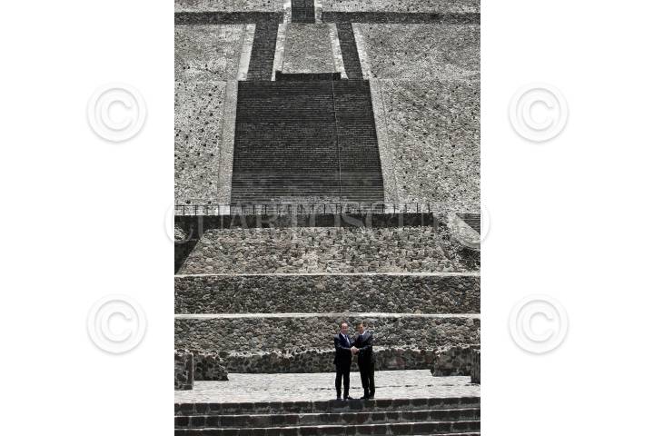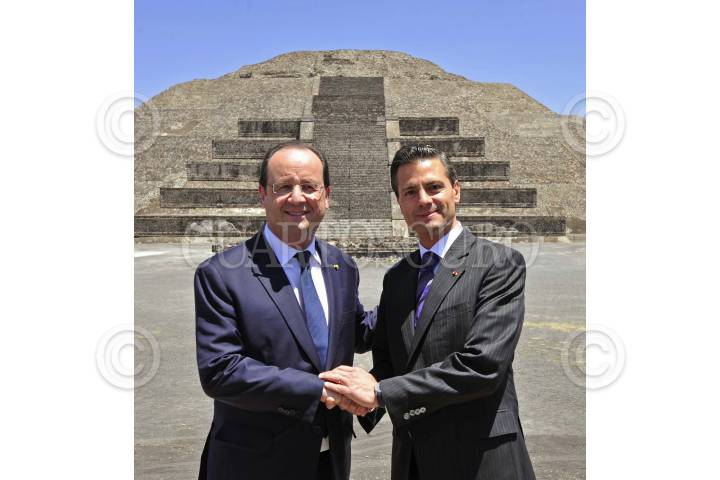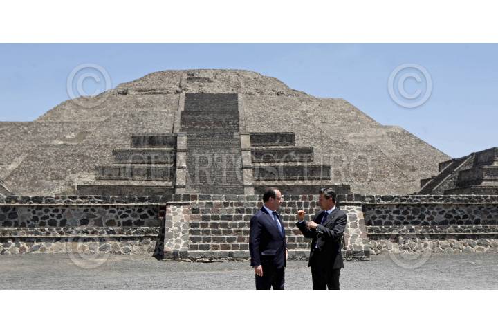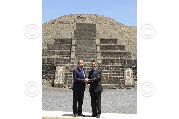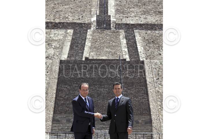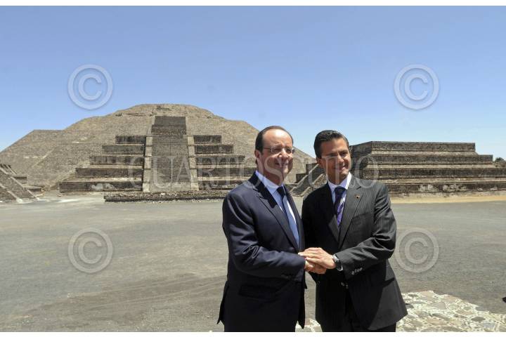TEOTIHUACÁN, ESTADO DE MÉXICO, 11ABRIL2014.- En el marco de la Visita de Estado que realiza a México el Mandatario galo, el Presidente de México, Enrique Peña Nieto, y su homólogo de la República Francesa, François Hollande, recorrieron la zona arqueológica de Teotihuacán. Ambos estuvieron en la Plaza de Pirámide de la Luna, donde se tomaron la fotografía oficial de su visita al sitio, y recorrieron también la Pirámide del Sol y el Palacio de Quetzalpapálotl. FOTO: PRESIDENCIA /CUARTOSCURO.COM