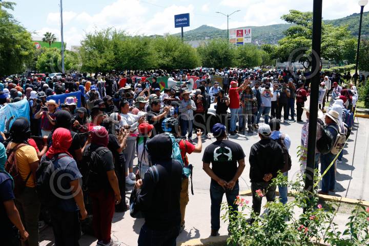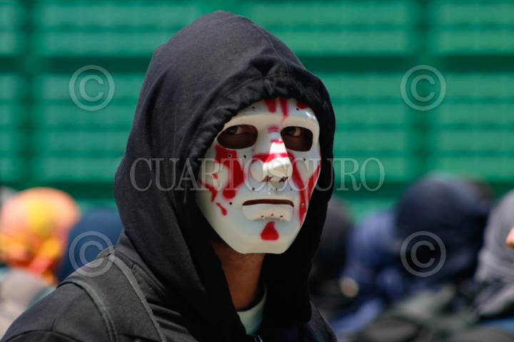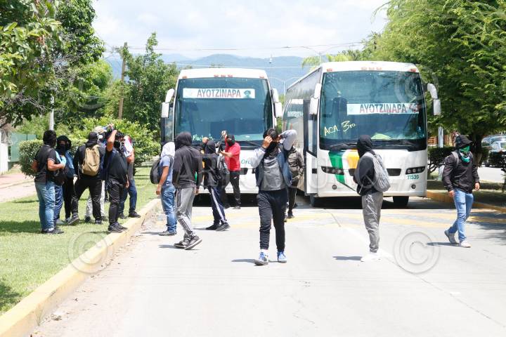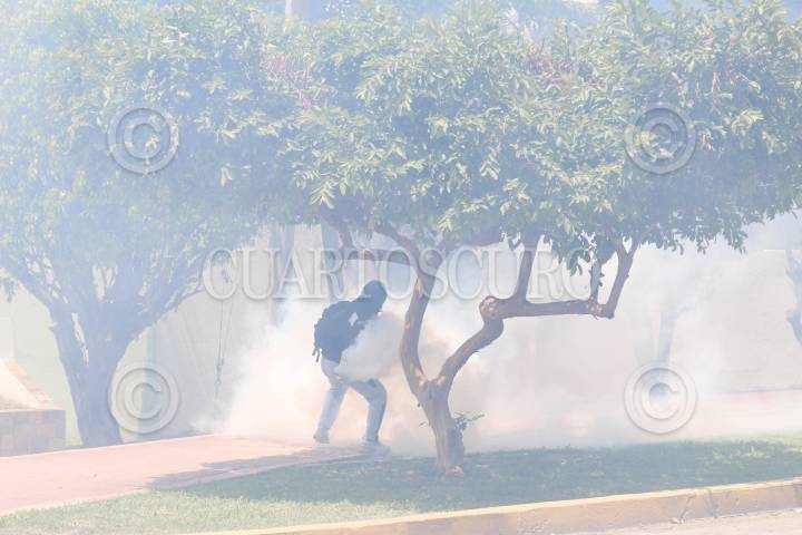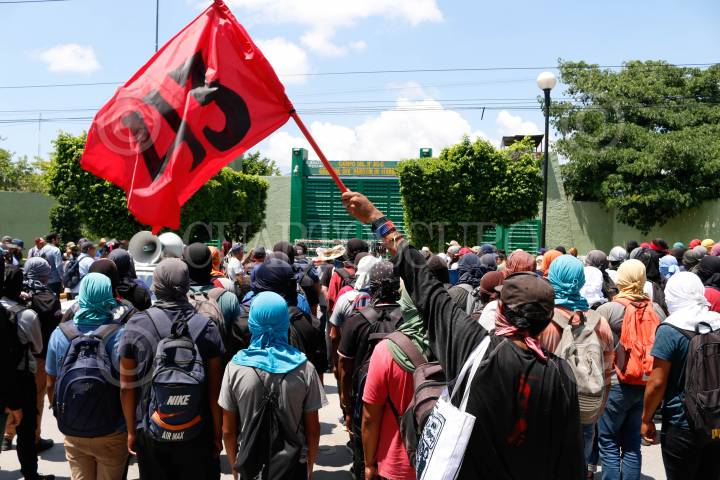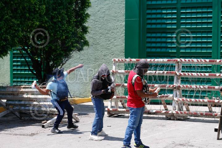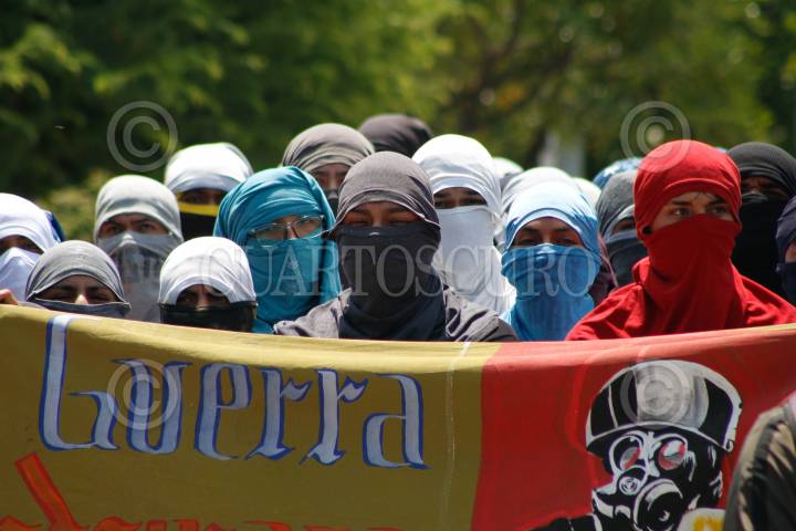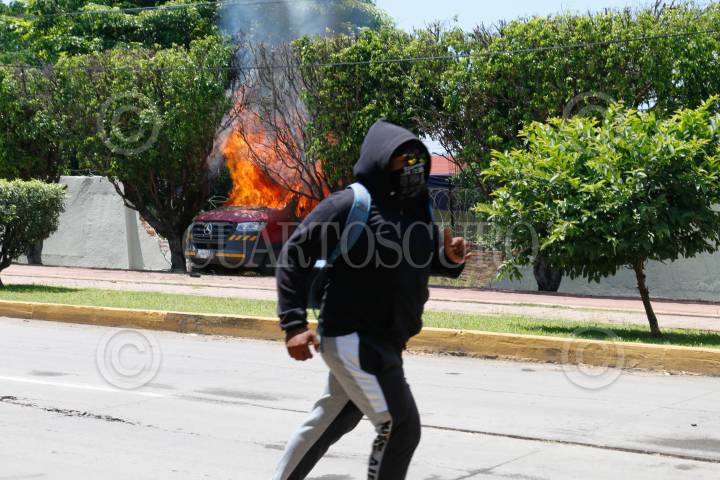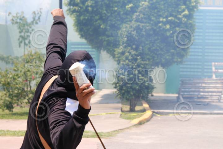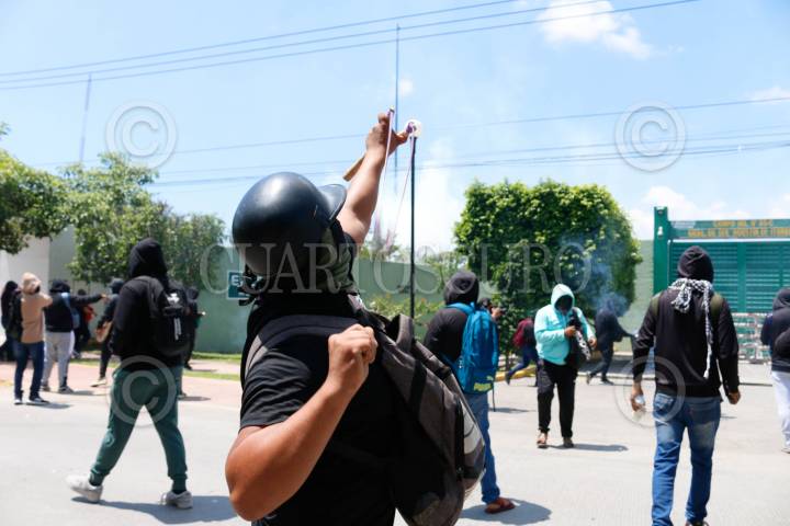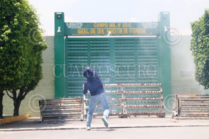 CHILPANCINGO, GUERRERO, 20SEPTIEMBRE2024.- Estudiantes normalistas de la Normal Rural “Raúl Isidro Burgos” de Ayotzinapa, Guerrero, derribaron el muro de la zona militar de Iguala y lanzaron petardos a su interior durante el tercer día de la jornada de lucha rumbo a los 10 años de la desaparición de sus 43 compañeros. Anteriormente, padres y madres de los estudiantes desaparecidos realizaron un mitin en la zona militar. Los jóvenes con el rostro cubierto utilizaron na camioneta de color rojo como ariete para derribar el muro derecho de la entrada principal. FOTO: DASSAEV TÉLLEZ ADAME/CUARTOSCURO.COM