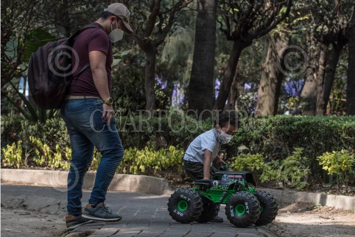 Un niño juega con un carro de control remoto en compañía de su papá en el tradicional día de reyes.