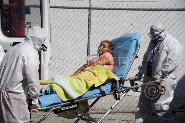 Paramédicos de la Cruz Roja Mexicana trasladan a una mujer con síntomas covid-19 al Triage Respiratorio del Hospital General la Villa.