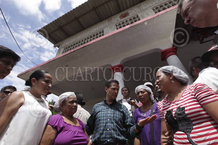COYUCA DE BENÍTEZ, GUERRERO, 24SEPTIEMBRE2013.- El drama que viven los damnificados por el paso de la tormenta tropical Manuel salió a relucir ante el presidente Enrique Peña Nieto que encontró reclamos por la falta de ayuda en comunidades y colonias de la Cabecera municipal que fueron arrasadas por las corrientes de agua del río San Miguel que rebasó sus niveles históricos inundando viviendas, arrasando con cultivos y sembradíos, dejando sin nada a familias completas. Antes, al descender del helicóptero en el playón que dejó la creciente del río, Peña Nieto escuchó de parte del coronel de Infantería del 65 Batallón, Manuel Martínez Vicente la evaluación de los daños que tuvo el municipio al que llegó con los primeras lluvias de la tormenta Manuel para coordinar las acciones apoyo a la población civil, como parte de la aplicación del Plan DNIII. Dio los pormenores de las comunidades que aún siguen con severos daños, y de las afectaciones a la infraestructura carretera del municipio que colapsó en diversos tramos. FOTO: BERNANDINO HERNÁNDEZ /CUARTOSCURO.COM