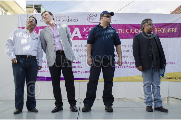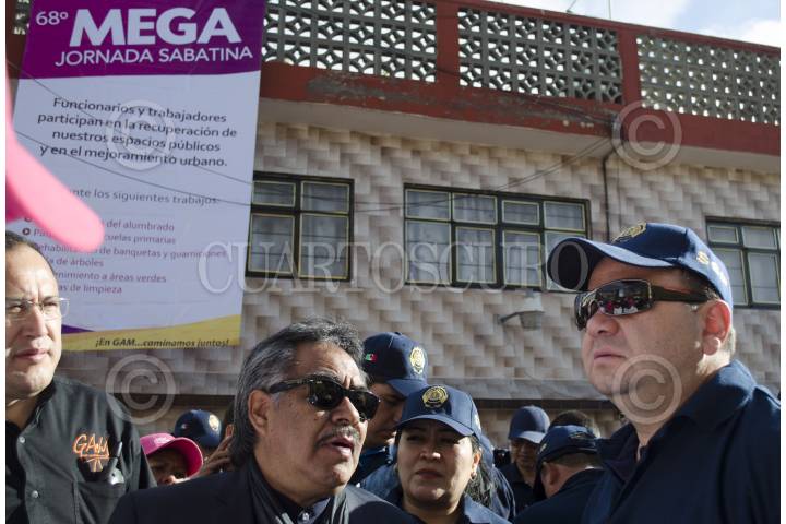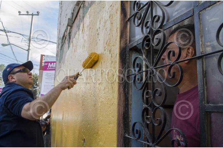 MÉXICO, DF., 15FEBRERO2014.- Jesús Rodríguez Almeida, titular de la Secretaría de Seguridad Pública del Distrito Federal (SSPDF), acompañado del diputado por Gustavo A. Madero, Victor Hugo Lobo, acudieron a la 68 Mega Jornada Sabatina "tu ciudad te requiere", en donde 200 elementos de seguridad capitalina realizaron labores de pintura en algunas fachadas y banquetas de la calle Cabo Hornos, en la colonia Gabriel Hernández. La delegación Gustavo A. Madero, ubicada al norte de la capital, se encuentra en el quinto lugar de las entidades con mayor pobreza dentro de la capital, reveló un estudio publicado por el Consejo Nacional de Evaluación de la Política de Desarrollo Social (Coneval) en 2010, con un 30.7 por ciento de habitantes que viven en situación de marginalidad. FOTO: MARÍA JOSÉ MARTÍNEZ /CUARTOSCURO.COM