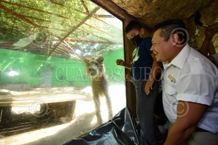 Fue presentado el león africano Michi, nuevo integrante de la familia de felinos de Zoochilpan en Chilpancingo, Guerrero.