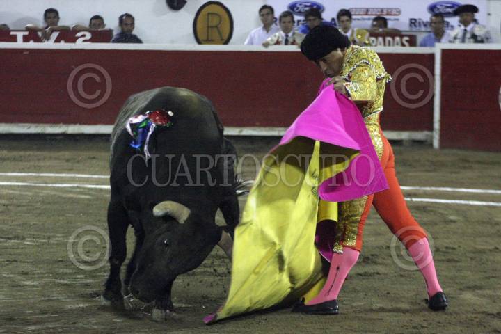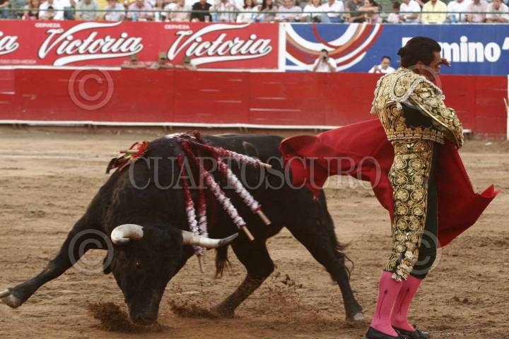 GUADALAJARA, JALISCO 29OCTUBRE2006.- El matador Eulalio Lopez "Zotoluco" solo pudo cortarle una oreja que fue protestada a su primer enemigo en el mano a mano sostenido esta tarde en la paza de toros nuevo progreso, pero se dio tiempo para corear algunos "olés" para su alternante Cesar Rincón. FOTO: JOSÉ MARÍA MARTÍNEZ/CUARTOSCURO.COM