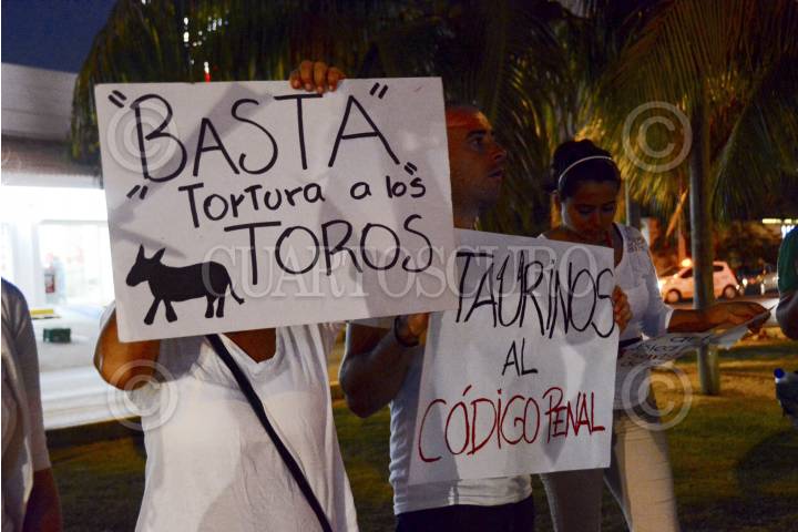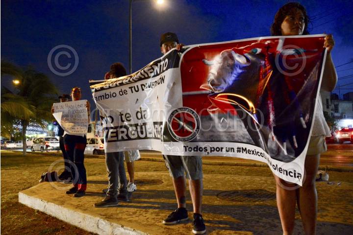 CANCÚN, QUINTANA ROO, 30ABRIL2016.- Previo a la corrida de Eulalio López Zotoluco, manifestantes muestran pancartas en rechazo a los eventos taurinos, esto afuera de la plaza de toros. FOTO: CUARTOSCURO.COM