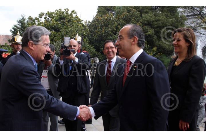 BOGOTA, COLOMBIA, 13AGOSTO2009.- Alvaro Uribe, presidente de Colombia, Felipe Calderón, presidente de México y Margarita Zavala, esposa del presidente de México, a su arribo al Palacio Nariño. FOTO: ALFREDO GUERRERO/CUARTOSCURO.COM
