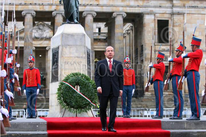 BOGOTA, COLOMBIA, 13AGOSTO2009.- Felipe Calderón, presidente de México, durante la ceremonia de colocación de ofrenda floral en el Monumento a Simon Bolivar, que tuvo lugar en la Plaza de Bolivar. FOTO: ALFREDO GUERRERO/CUARTOSCURO.COM
