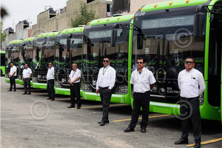CIUDAD DE MÉXICO, 04OCTUBRE2024.- Trabajadores del Transporte de Pasajeros de la Ciudad de México (RTP), durante la entrega de 50 camiones de pasajeros eléctricos por parte del jefe de Martí Batres. FOTOS: ROGELIO MORALES /CUARTOSCURO.COM