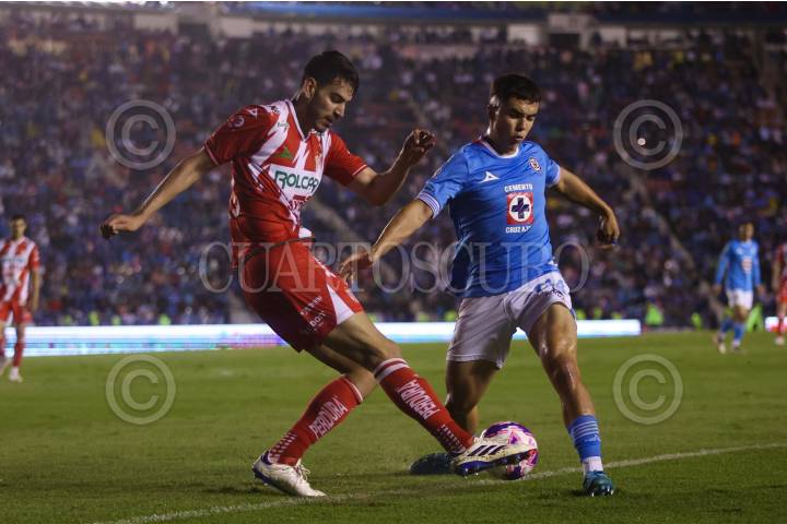 CIUDAD DE MÉXICO, 05OCTUBRE2024. Alán Montes de los Hidrorayos intenta despejar tras la llegada de Mateo Levy de la Máquina Celeste durante el partido de fútbol Cruz Azul vs Necaxa correspondiente a la jornada 11 del Torneo Apertura 2024 de Liga BBVA MX, en el Estadio Ciudad de los Deportes. FOTO: EDGAR NEGRETE LIRA/CUARTOSCURO.COM