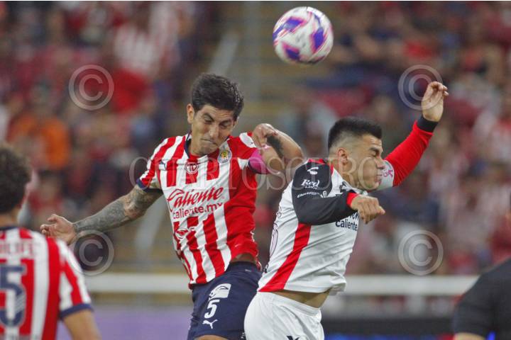 ZAPOPAN, JALISCO, 05OCTUBRE2024.-Victor Guzmán jugador de Chivas, disputa el balón con el contrario de Atlas, Aldo Rocha, esto en partido correspondiente a la Jornada 11 del Torneo Apertura 2024 de la Liga MX, en donde se enfrentan los equipos de Chivas vs Atlas y en juego que se lleva a cabo en el Estadio Akron, el marcador al momento es de 1-0, a favor del equipo visitante. FOTO: FERNANDO CARRANZA GARCIA / CUARTOSCURO.COM