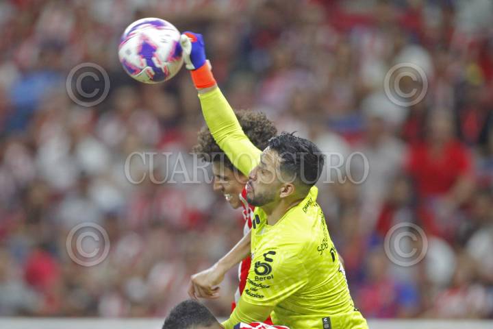 ZAPOPAN, JALISCO, 05OCTUBRE2024.-Camilo Vargas jugador de Atlas, disputa el balón con el contrario de Chivas, Erick Gutiérrez, esto en partido correspondiente a la Jornada 11 del Torneo Apertura 2024 de la Liga MX, en donde se enfrentan los equipos de Chivas vs Atlas y en juego que se lleva a cabo en el Estadio Akron, el marcador al final es de 3-2 a favor del equipo visitante. FOTO: FERNANDO CARRANZA GARCIA / CUARTOSCURO.COM
