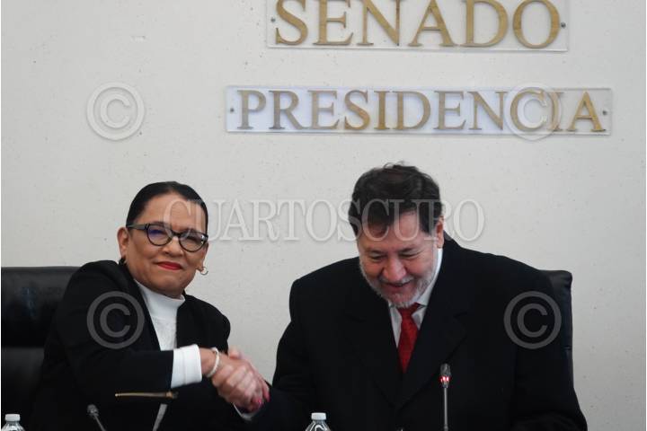 CIUDAD DE MÉXICO, 07OCTUBRE2024.- Rosa Isela Rodríguez, secretaria de Gobernación, saludó a Gerardo Fernández Noroña, presidente de la mesa directiva del Senado de la República, durante la entrega del paquete de iniciativas de Claudia Sheinbaum, presidenta de México, en el Senado de la República. FOTO: GRACIELA LÓPEZ/CUARTOSCURO.COM
