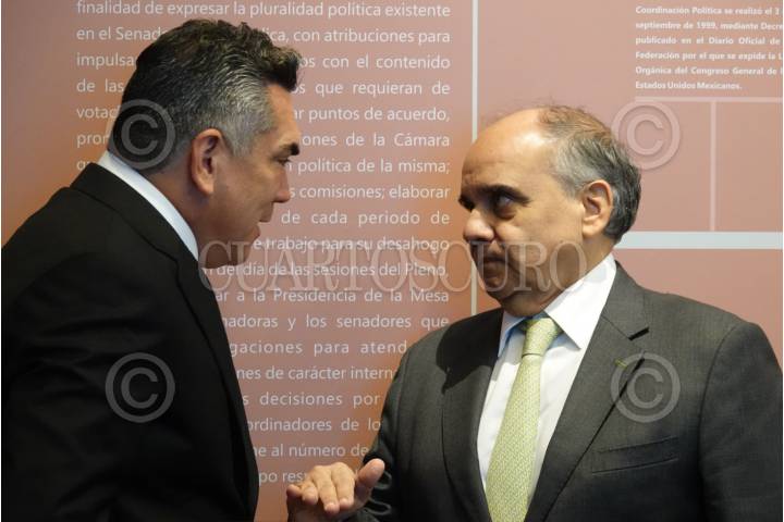 CIUDAD DE MÉXICO, 08OCTUBRE2024.- Los senadores Alejandro Moreno Manuel Añorve conversaron durante la comparecencia de Juan Ramón de la Fuente como secretario de Relaciones Exteriores en el Senado de la República, casa Xicoténcatl. FOTO: GRACIELA LÓPEZ/CUARTOSCURO.COM