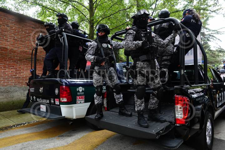 CIUDAD DE MÉXICO, 09OCTUBRE2024.- Elementos policiacos de diversas corporaciones durante la presentación del Operativo Conjunto “Prevención del Delito Cuajimalpa - Huixquilucan - Miguel Hidalgo”, dando el banderazo de salida de patrullajes en el Parque de Granados en Bosques de las Lomas. FOTOS: ROGELIO MORALES /CUARTOSCURO.COM