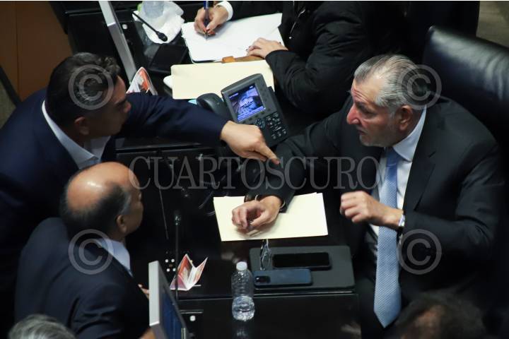 CIUDAD DE MÉXICO, 10OCTUBRE2024.- Alejandro Moreno, senador del PRI y Adán Augusto López, senador de Morena, dialogan durante la discusión de las leyes secundarias de la Reforma Judicial. FOTO: DANIEL AUGUSTO/ CUARTOSCURO.COM