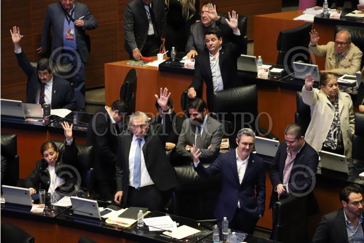 CIUDAD DE MÉXICO, 10OCTUBRE2024.- La bancada de Morena en el Senado, encabezada por Adán Augusto López, vota en torno a una de las reservas presentadas durante la sesión de este jueves. FOTO: DANIEL AUGUSTO/ CUARTOSCURO.COM