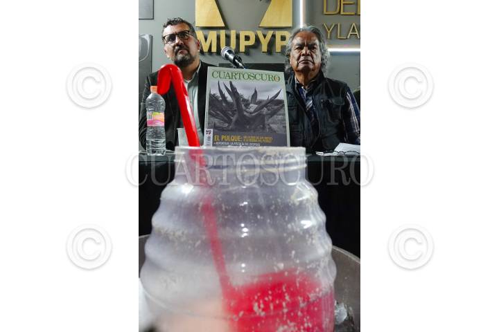 CIUDAD DE MÉXICO, 11OCTUBRE2024.- Pedro Valtierra, director fundador de la Agencia Cuartoscuro y Jorge García, durante la presentación de la revista Cuartoscuro 182 la cual está dedicada a la bebida ancestral El Pulque, elixir de los pueblos a la bebida del pueblo, dicha presentación se llevó acabo en el Museo del Pulque y de las Pulquerías. FOTO: ROGELIO MORALES /CUARTOSCURO.COM