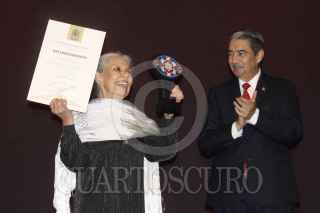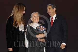 SAN LUIS POTOSÍ, SAN LUIS POTOSÍ, 12OCTUBRE2024.- La actriz Luisa Huertas recibió el premio “Peyote” y el reconocimiento por sus 55 años de trayectoria artística, así como en el teatro, televisión y cine al cierre del 7o. Festival de Cine UASLP. La acompañó Alejandro Javier Zermeno Guerra, rector de la Universidad Autónoma de San Luis Potosí. FOTO: MARCELO PALACIOS/CUARTOSCURO.COM