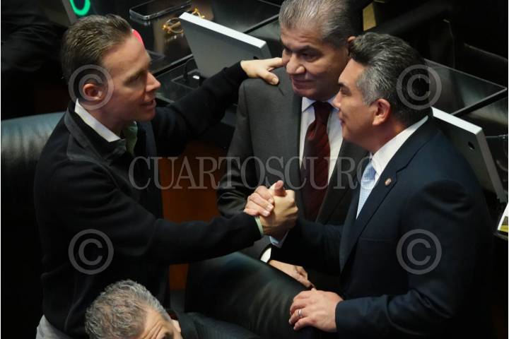 CIUDAD DE MÉXICO, 15OCTUBRE2024.- Los senadores Manuel Velasco (Partido Verde) y Alejandro Moreno (PRI), se saludaron durante la Sesión Ordinaria en el Senado de la República. FOTO: GRACIELA LÓPEZ/CUARTOSCURO.COM