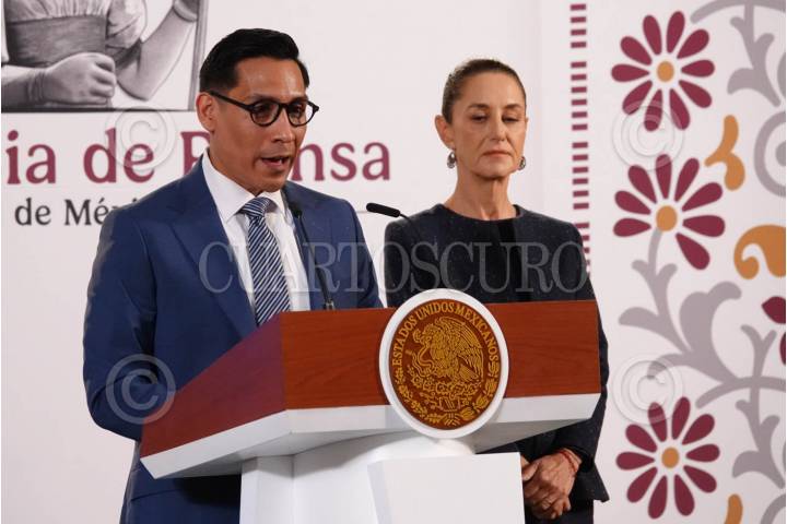 CIUDAD DE MÉXICO, 16OCTUBRE2024.- Miguel Ángel Alorza Vásquez, coordinador de Infodemia, acompañado de Claudia Sheinbaum, presidenta constitucional de los Estados Unidos Mexicanos, durante su participación en la Sección "Detector de Mentiras" durante la Mañanera del Pueblo en el Salón Tesorería en Palacio Nacional. FOTO: GRACIELA LÓPEZ/CUARTOSCURO.COM