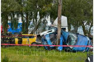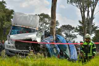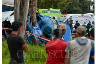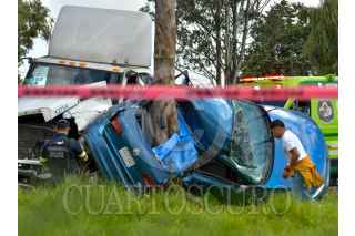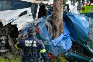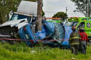 TOLUCA, ESTADO DE MÉXICO, 16OCTUBRE2024.- Dos personas murieron al ser impactado el vehículo que viajaban por un tráiler en la carretera Toluca-Palmillas, a la altura del Mercado de Aviación Autopán, el automóvil terminó incrustado en un árbol, la zona se encuentra fue acordonada y los cuerpos de emergencia laboran en n el lugar. FOTO: CRISANTA ESPINOSA AGUILAR /CUARTOSCURO.COM