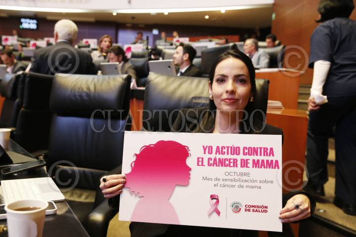 CIUDAD DE MÉXICO, 16OCTUBRE2024.-La senadora Laura Esquivel Torres sostiene un cartel con la leyenda "Yo actúo contra el cáncer de mama", durante la sesión en el Senado. FOTO: CUARTOCURO.COM