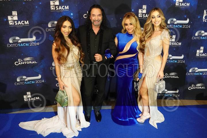 CIUDAD DE MÉXICO, 16OCTUBRE2024.- Alison Solís, Marco Antonio Solís, Cristian Salas y Marla Solís, durante la alfombra roja de los premios Éxitos SACM 2024 de Sociedad de Autores y Compositores de México en donde fue galardonado el cantautor michoacano Marco Antonio Solís, en el auditorio Roberto Cantoral. FOTO: ROGELIO MORALES /CUARTOSCURO.COM