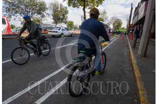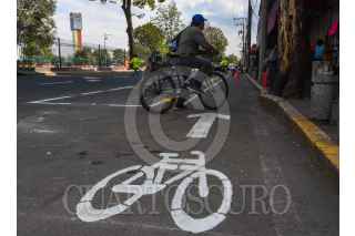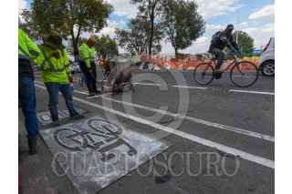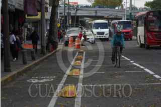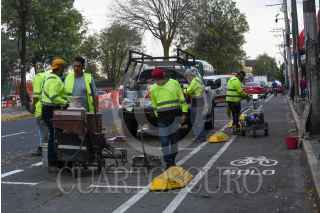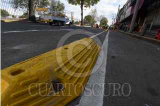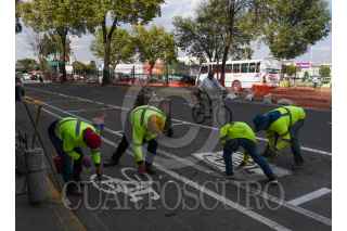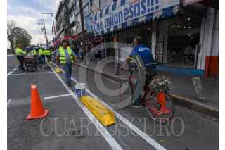 TOLUCA, ESTADO DE MÉXICO, 17OCTUBRE2024.- Avanzan los trabajos en la ciclovía de la avenida Isidro Fabela en la ciudad de Toluca, en la zona de la Terminal de Autobuses y el Mercado Juárez, trabajadores realizan la instalación de delineadores de carril, pinta de cajones y señalamientos, después de varias manifestaciones por parte de comerciantes de esta vialidad que rechazan la ciclovía. FOTO: CRISANTA ESPINOSA AGUILAR /CUARTOSCURO.COM
