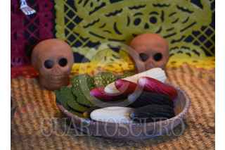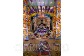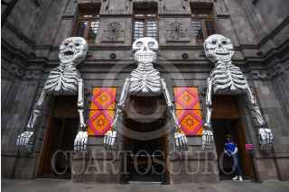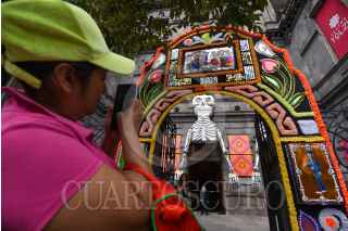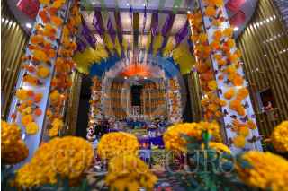TOLUCA, ESTADO DE MÉXICO, 17OCTUBRE2024.- El Centro Tolzú instaló su tradicional Ofrenda del Día de Muertos, en la cual se pueden observar diversos elementos como un tapete de aserrín, figuras de cartoneria, alfeñique, algunos alimentos, papel picado, flores de cempasúchil, entre otros, que se complementa con una instalación monumental de calaveras a gran escala de cartoneria que da la bienvenida a esta ofrenda. FOTO: CRISANTA ESPINOSA AGUILAR/CUARTOSCURO.COM