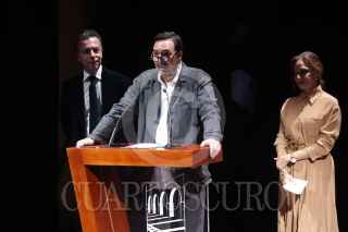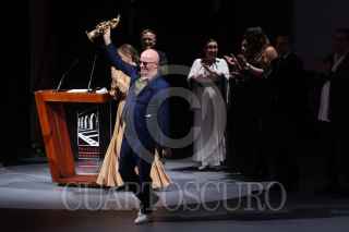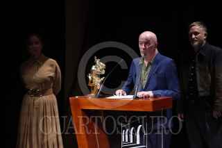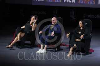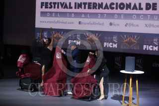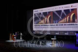 MORELIA, MICHOACÁN, 18OCTUBRE2024. Karla Sofía Gascón, Jacques Audiard y Adriana Paz develan las butacas con su nombre que permanecerán en una sala de cine durante la ceremonia de inauguración del 22° Festival Internacional de Cine de Morelia. FOTO: EDGAR NEGRETE LIRA/CUARTOSCURO.COM