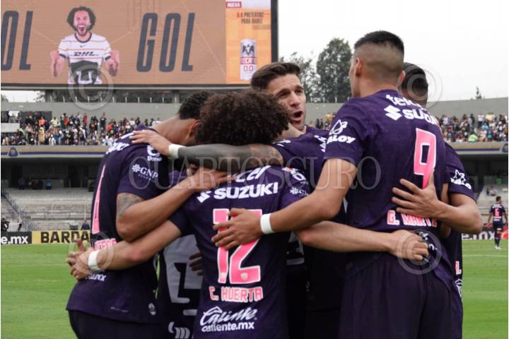 CIUDAD DE MÉXICO, 20OCTUBRE2024.- Jugadores del equipo de los Pumas celebraron el primero gol anotado a su favor contra San Luis durante la Jornada 12 de la Liga MX en el Estadio Olímpico Universitario. FOTO: GRACIELA LÓPEZ/CUARTOSCURO.COM