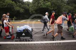 TAPACHULA, CHIAPAS, 20OCTUBRE2024.- Personas migrantes de diferentes nacionalidades partieron en caravana de este municipio, esto luego de que señalaron que esperaron por semanas la cita donde solicitaron asilo en Estados Unidos, conocida como CBP ONE, sin obtener respuesta, por lo que decidieron aventurarse rumbo a frontera norte. La mayoría de las personas llevan a sus hijos en brazos y carreolas. FOTO: DAMIÁN SÁNCHEZ/CUARTOSCURO.COM