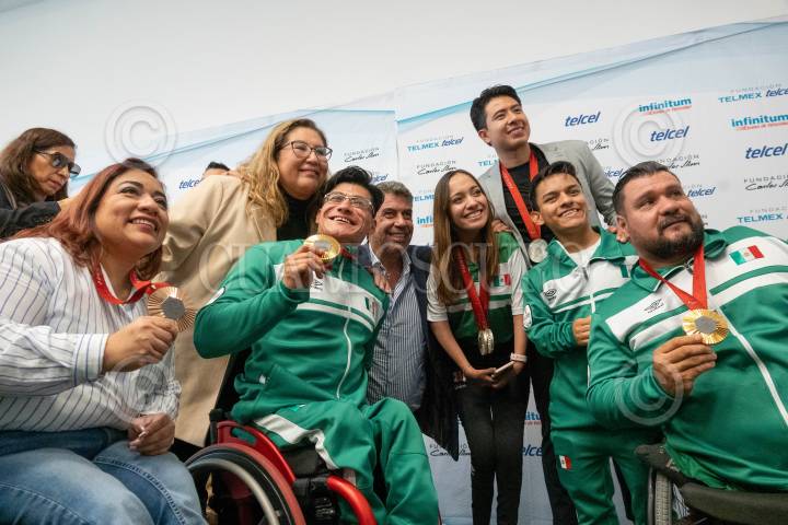CIUDAD DE MÉXICO, 22OCTUBRE2024.- Arturo Elías Ayub, presidente de la Fundación Telmex Telcel, presidió la entrega de apoyos económicos los medallistas de los Juegos de París 2024. En la imagen lo acompañan Amalia Pérez, Juan Pablo cervantes, Haidee Viviana Aceves Pérez, Luis Nájera, Jesús Gutiérrez, y Arnulfo Castorena. FOTO: MOISÉS PABLO/CUARTOSCURO.COM