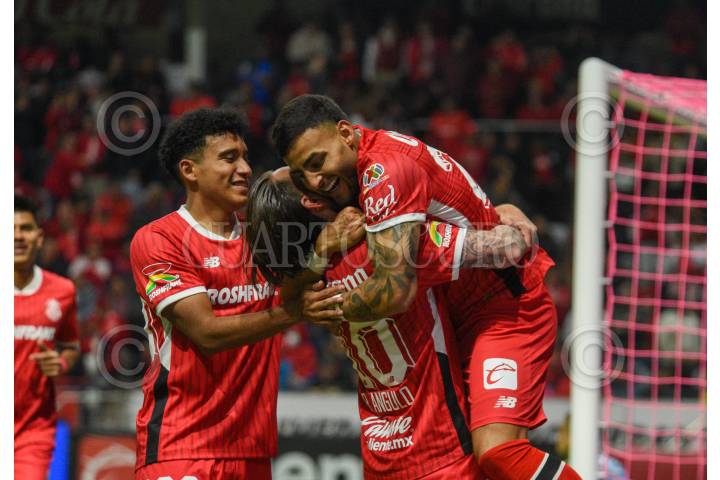 TOLUCA, ESTADO DE MÉXICO, 22OCTUBRE2024.- Jugadores de los Diablos de Toluca festejan la victoria ante la Franja de Puebla en la cancha del estadio Nemesio Diez, en el partido correspondiente a la jornada 13 del Torneo Apertura 2024 de la Liga MX, el encuentro terminó con un marcador 5-0. FOTO: CRISANTA ESPINOSA AGUILAR /CUARTOSCURO.COM