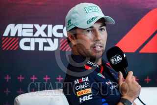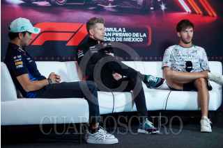 CIUDAD DE MÉXICO, 24OCTUBRE2024.- Los pilotos Sergio “Checo” Pérez (Oracle Red Bull Racing), Nico Hulkenberg (MoneyGram Haas) y Pierre Gasly (BWT Alpine) durante la conferencia de pilotos en el marco del primer día de actividad del Gran Premio de la Ciudad de México que se celebra en el Autódromo Hermanos Rodríguez. FOTO: GALO CAÑAS/CUARTOSCURO.COM