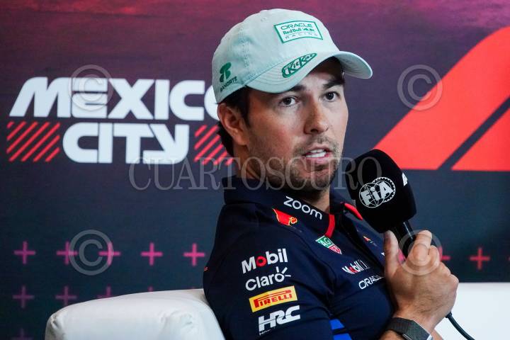 CIUDAD DE MÉXICO, 24OCTUBRE2024.- El piloto mexicano de la escudería Oracle Red Bull Racing Sergio “Checo” Pérez durante la conferencia de pilotos en el marco del primer día de actividad del Gran Premio de la Ciudad de México que se celebra en el Autódromo Hermanos Rodríguez. FOTO: GALO CAÑAS/CUARTOSCURO.COM