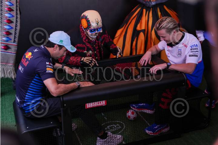 CIUDAD DE MÉXICO, 24OCTUBRE2024.- Los pilotos Sergio “Checo” Pérez (Oracle Red Bull Racing) y Liam Lawson (Visa Cash App RB) se enfrentan en un partido de “fútbolito” durante el primer día de actividades del Gran Premio de la Ciudad de México de la Fórmula 1. FOTO: GALO CAÑAS/CUARTOSCURO.COM