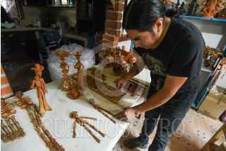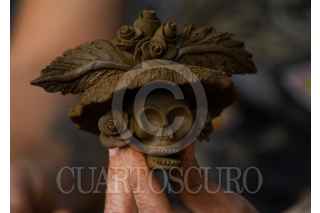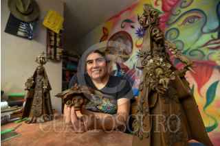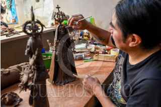 METEPEC, ESTADO DE MÉXICO, 24OCTUBRE2024.- Cecilio Sánchez Fierro artesano de Metepec con más de 30 años dándole vida al barro y siendo la cuarta generación en su familia, herencia de sus abuelos maternos, que se dedicaban a hacer cazuelas y utilitarios, aprende de sus hermanos y su papá, en su taller trabaja árboles de la vida, virgenes, pero las piezas más representativas son las catrinas, calaveras, cráneos, esqueletos, monjas coronadas, que son muy pedidas durante la celebración de Día de Muertos, pero las trabaja todo el año, las técnicas por las que se reconoce su trabajo es por el barro pigmentado, arcillas naturales y actualmente el barro negro, elabora piezas pequeñas que van desde los 3 cm hasta las más grande que ha llegado a ser de 2 metros de altura; su papá empezó a elaborar piezas como estas de todo tipo, y ahí nace el gusto por las mismas, considera que la expresión en la muerte es muy amplia. En su taller abre las puertas a la juventud para que aprendan este hermoso trabajo, a pesar de que a los jóvenes ya no les interesa aprender el manejo del barro, es ferviente admirador de todas la artesanía pide que se valore el trabajo de los artesanos y no se regatee, su trabajo se puede adquirir en el Mercado Artesanal ubicado muy cerca del centro de Metepec o a través de sus redes sociales. FOTO: CRISANTA ESPINOSA AGUILAR /CUARTOSCURO.COM